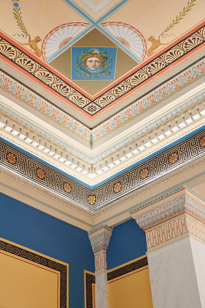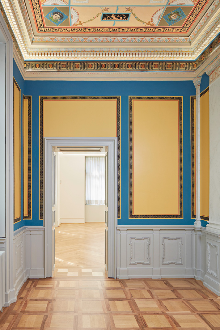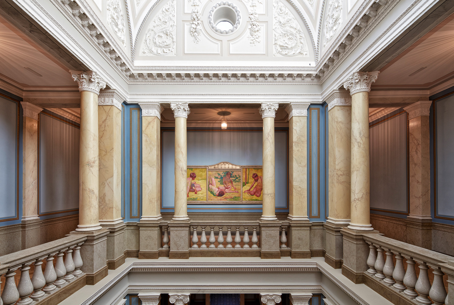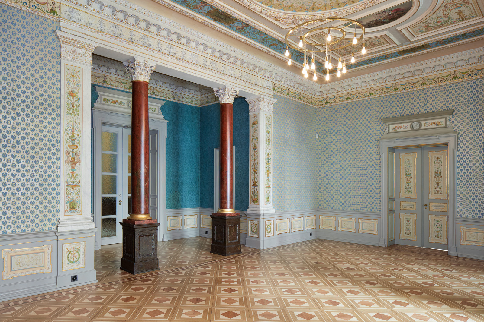 Für die Instandstellung der Dekorationsmalereien sind folgende zu nennen: Schablonenmalerei im Foyer, Vestibül und Atrium. Marmorierungen im Vestibül und Atrium. Maserierung im Billardsaal. Tapeten im Salon und Billardsaal.
