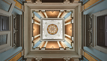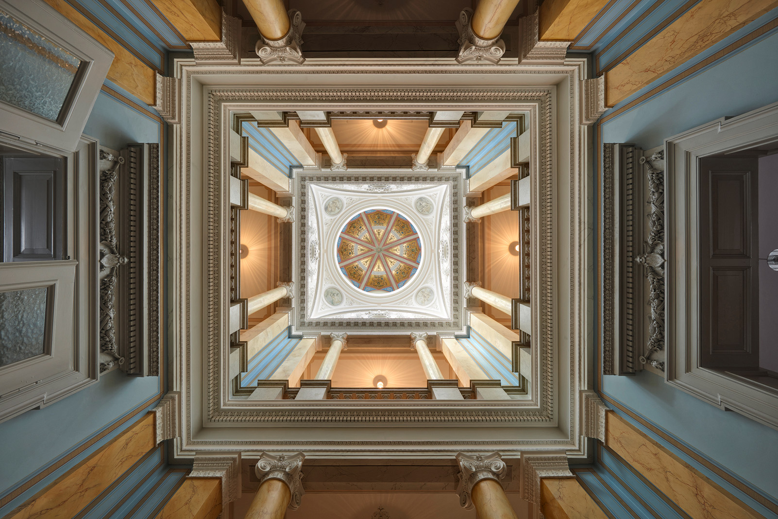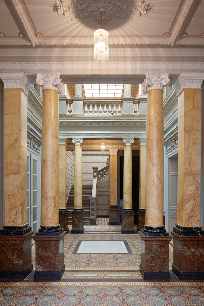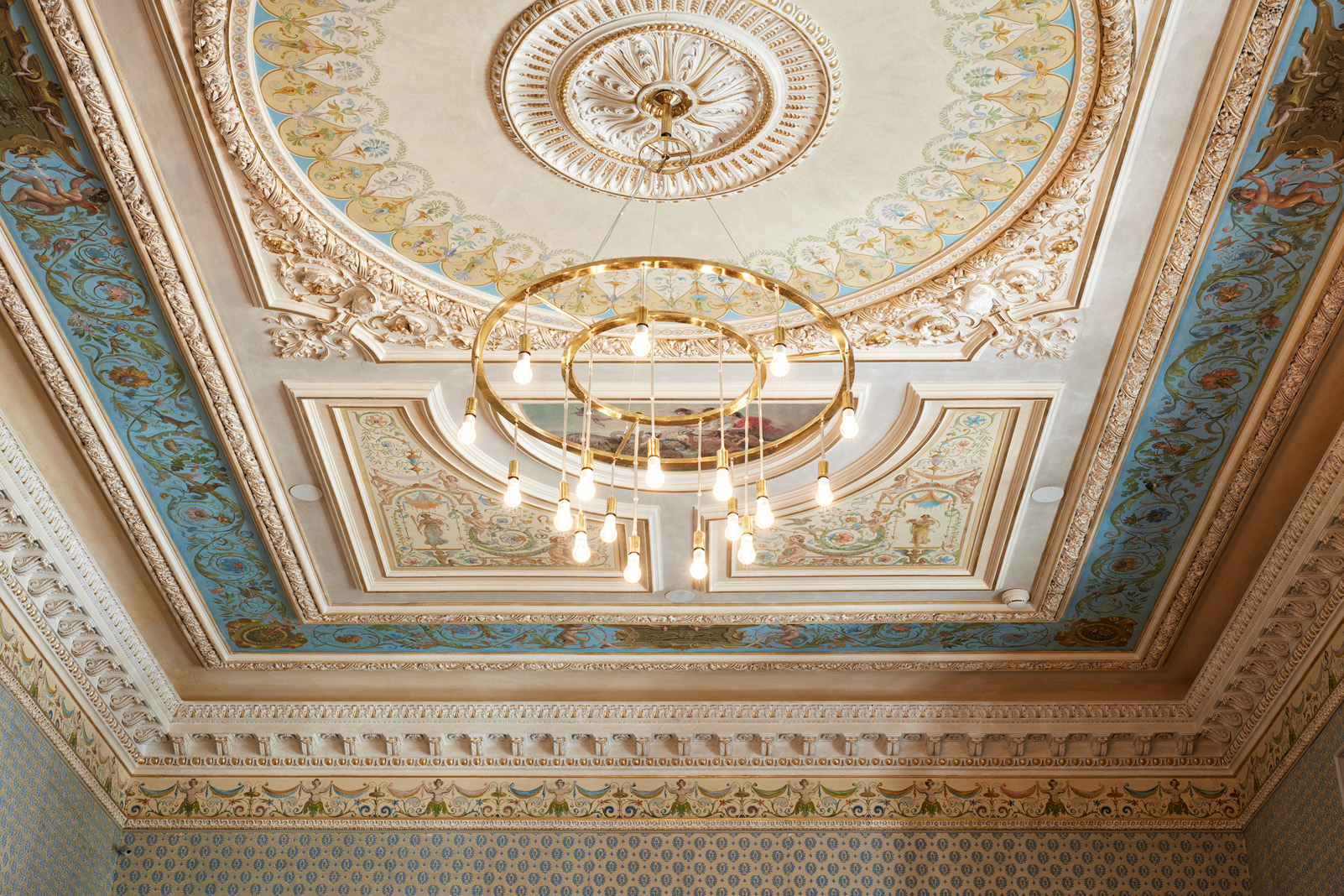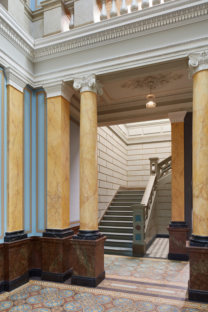 Für die Instandstellung der Dekorationsmalereien sind folgende zu nennen: Schablonenmalerei im Foyer, Vestibül und Atrium. Marmorierungen im Vestibül und Atrium. Maserierung im Billardsaal. Tapeten im Salon und Billardsaal.